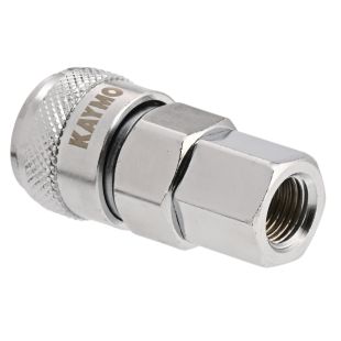 Female threading coupler. Kaymo branded. One touch application. Superior locking onto the adaptor. Same as Nitto type. Extremely wear resistant and durable.