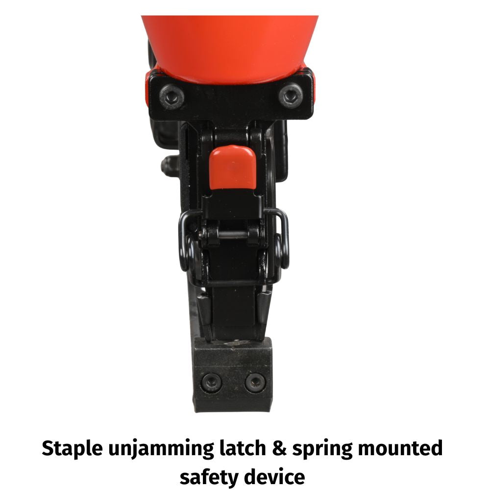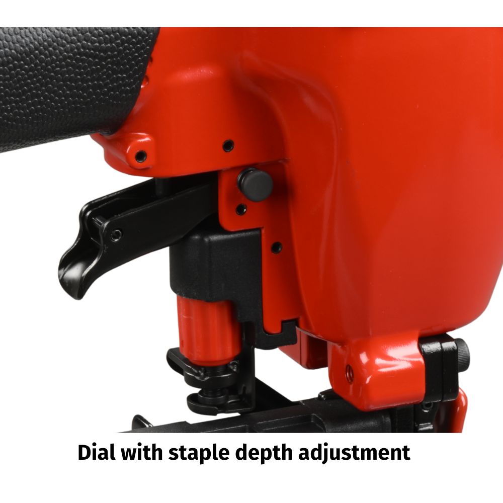 The Kaymo PRO-PS10040FJ is a heavy-duty pneumatic stapler with a folding jaw, designed for precision and durability. With a staple range of 16–40mm, depth adjustment,