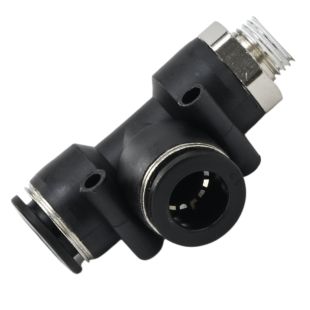 The KAYMO JPD1202 Branch Tee Push-to-Connect Fitting is designed for quick and reliable pneumatic connections. Its 1/4" male threading with thread lock provides a secure,